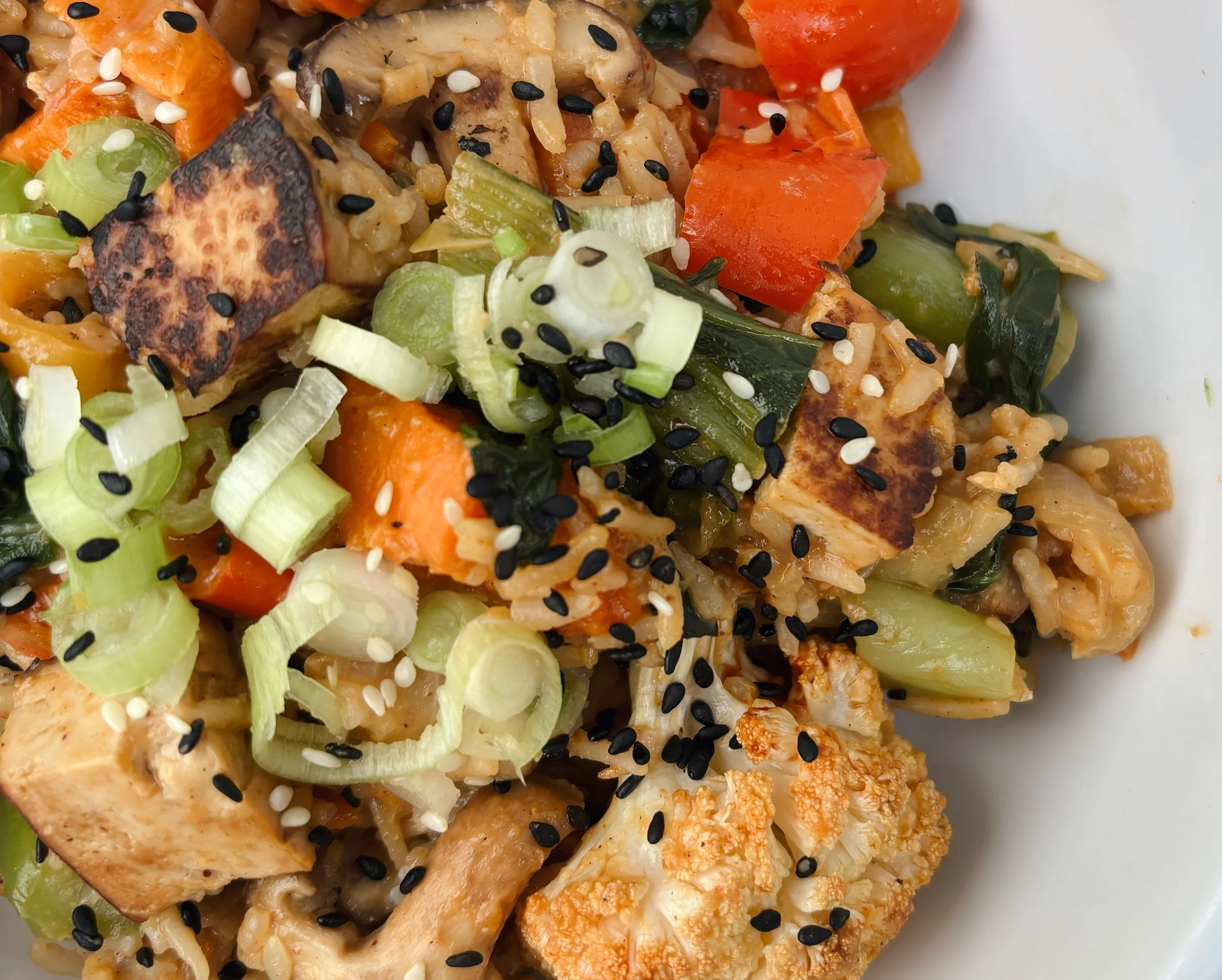 Combine cooked rice, roasted veggies, sautéed vegetables, and tofu in large bowls. Drizzle with the peanut sauce and toss gently to combine.